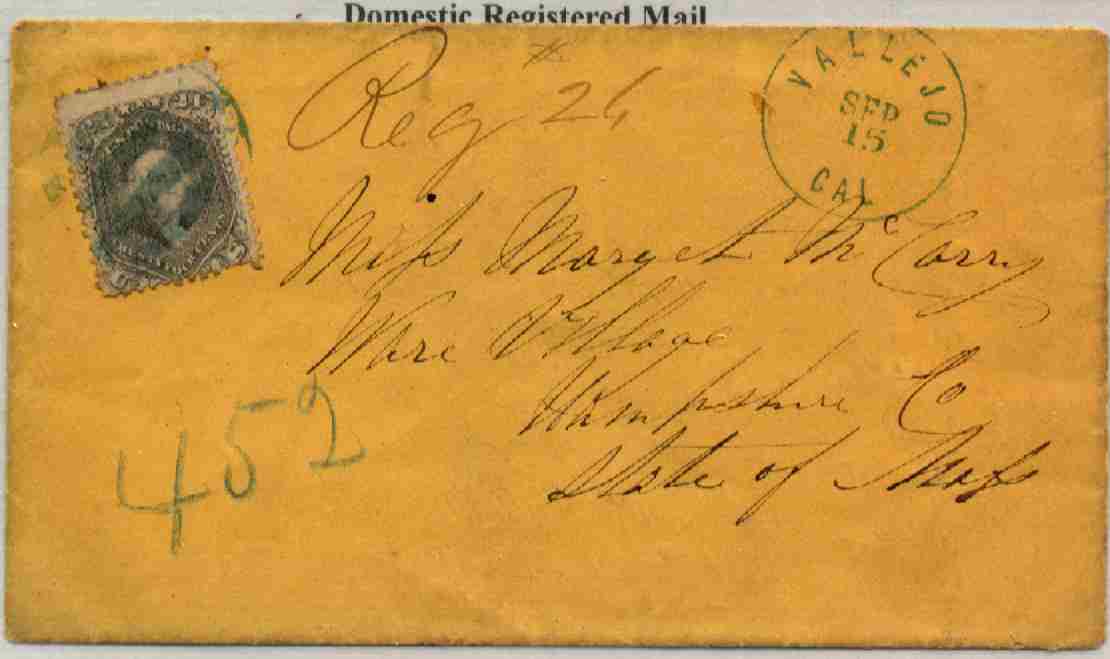 DESCRIPTION: An orange registered cover franked with a single 24 cent grayish lilac shade 1861 issue, perforated 12, postmarked with a blue VALLEJO/SEP 15/CAL cds, and canceled by a blue circular grid handstamp, with also a dark brown manuscript Reg #26 and blue crayon452, addressed to a Miss Margret McCarry, Ware Village, Hampshire County, Massachusetts.